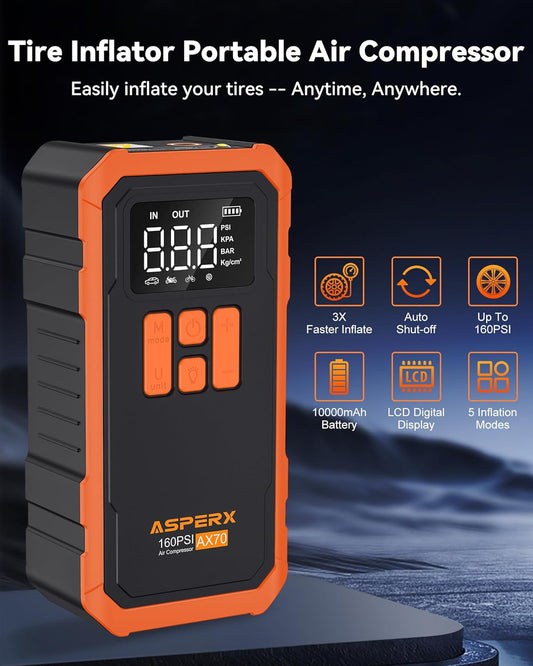 Tire Inflator Portable Air Compressor- 160PSI & 10000mAh Portable Air Pump with Carrying Case, LCD Display & LED Light, 3X Fast Inflation for Car, Bike, Motorcycle, Balls and more(Orange)