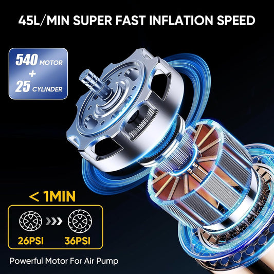 Tire Inflator Portable Air Compressor, 6X Faster 150 PSI 12000mAh Battery Air Compressor, Dual Digital Display Air Pump with Lighting - Portable Tire Inflator for Car, Bicycle, Auto Shut-Off