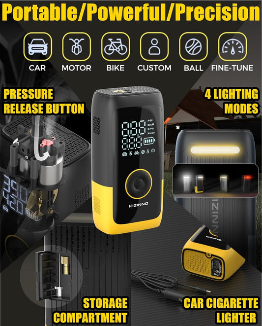Tire Inflator Portable Air Compressor - KIMHI 150 PSI Cordless Car Air Pump,2X Faster Pump with 10000mAh Rechargeable Battery,Digital Pressure Gauge, LED Light,For Car,Motorcycle and Ball
