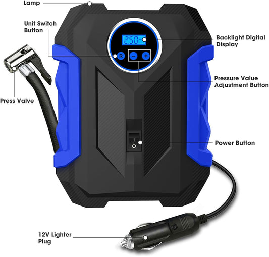 Digital Air Compressor for Car Auto Pump Portable Tire Inflator with LED Light DC 12V, Blue
