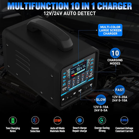 12V/24V 0-20A Heavy Duty Battery Charger/Maintainer with Auto Shutoff, Repair & Winter Mode, 10 Modes & Color Screen for Car, Truck, Motorcycle, RV, Boat, Lawn Mower, cargador de batería de carro