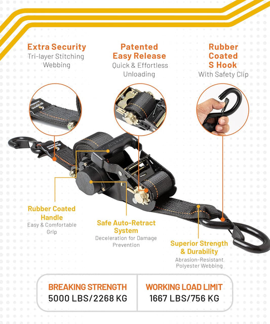 Strapinno Retractable Ratchet Tie-Down Straps,5,000 lbs Breaking Strength- 2 in x 12 ft Heavy Duty Ratchet Strap with Safety Lock S Hooks for Motorcycles, ATVs, UTVs, Lawn Equipment & Cargo (Black)
