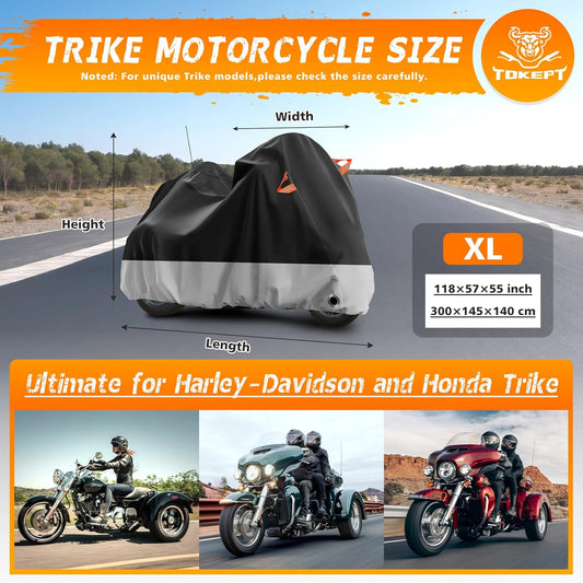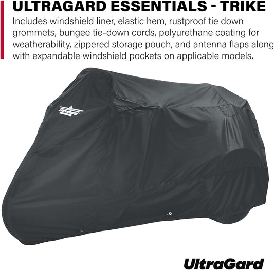 Motorcycle Trike Cover - Weather-Resistant with Elastic Hem, Rustproof Grommets, Storage Bag, Windshield Liner, Antenna Flaps & Expandable Windshield Pockets