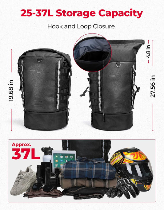 KEMIMOTO Motorcycle Sissy Bar Backrest Bag Upgraded Version, 37L Expandable Capacity PU Leather Motorcycle Tail Bag with Rain Cover, Luggage Backpack with Helmet Net & Shoulder Strap, Black