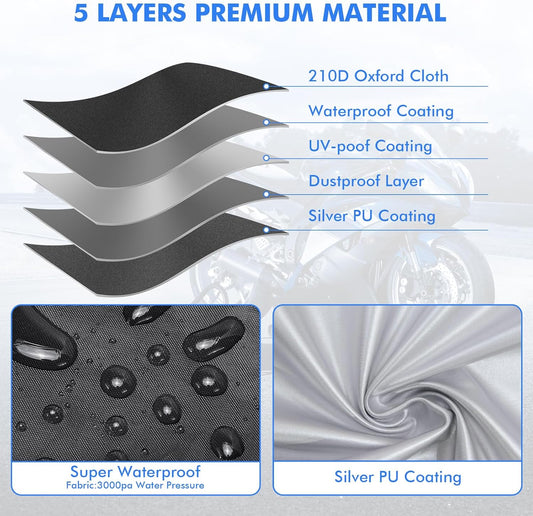 COVERVIN Motorcycle Cover, All Weather Outdoor Waterproof Night Protection with Reflective Strips, Locking Holes and Storage Bag for 86 Inch Suzuki, Kawasaki, Honda, Harley-Davidson(Silver M)