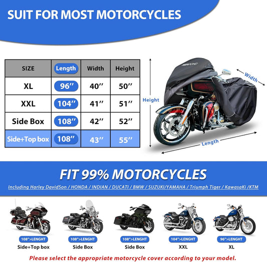 Motorcycle Cover Waterproof Outdoor with Cotton Lining, All Weather Protection from Rain, Dust & Snow - 300D Heavy Duty, Lock Holes, Storage Bag, Universal Fits up to 108" Motorcycles - MC2