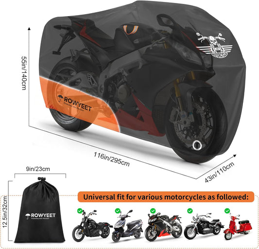 Motorcycle Cover Waterproof Outdoor Storage with Lock-Holes, Storage Bag & Night Reflective Design, All Season Protection Powersports Vehicle Covers Fits up to 116" Motorcycles