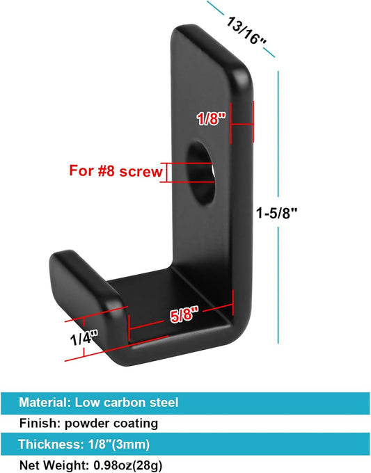10 Pack Mini Black Steel Utility J Hook, Wall Mount Hanging Hook for Garage Storage, 1-5/8" Height, 5/8" Inner Width