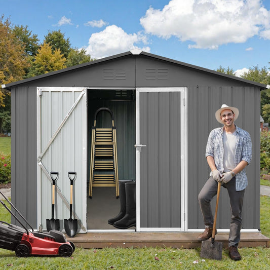 10 x 12 FT Outdoor Storage Shed, Metal Garden Tool Shed with Slooping Roof, Lockable Doors and Windows, Easy to Assemble for Garden, Patio, Lawn, Grey
