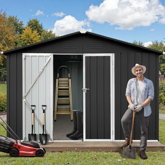 10 x 14 FT Outdoor Storage Shed, Metal Garden Tool Shed with Slooping Roof, Lockable Doors, All-Weather Bike Shed Easy to Assemble for Backyard, Patio, Lawn, White+Black