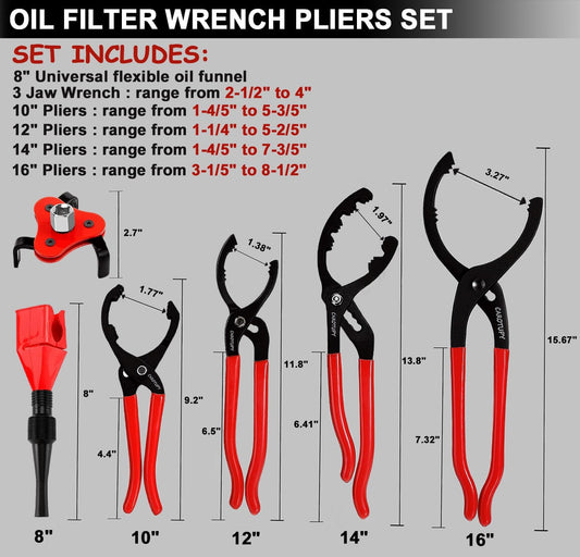 6Pcs Oil Filter Pliers Set, Universal Oil Filter Wrench with Oil Funnel, 10" & 12" & 14" & 16" Premium Oil Filter Removal Tool From 1-1/4" to 8-1/2"