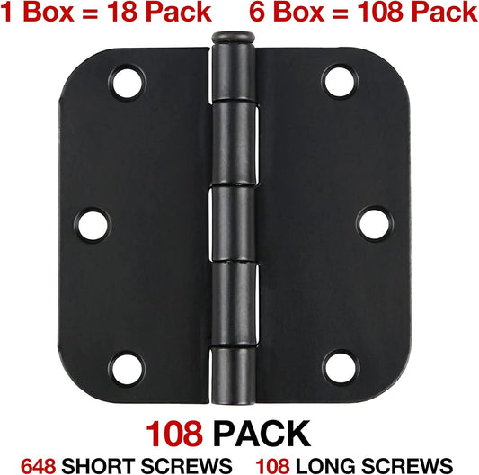 108 Pack Rounded Matte Black Door Hinges 3.5 Inch 5/8" Radius for Interior 3 1/2" Flat Iron Bifold Residential Standard Hinge Bedroom Indoor for Doors 3 ½"Hardware Heavy Duty Steel Regular Home Kit