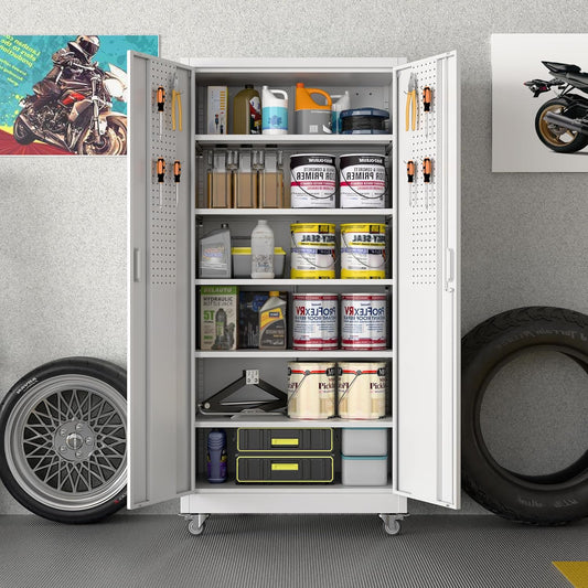 71" H×32" W×16" D Garage Storage Cabinet with Wheels, Locking Metal Storage Cabinet with 5 Adjustable Shelves, 4 Hooks and Pegboard for Garage, Home Office, Kitchen, Assembly Required, White