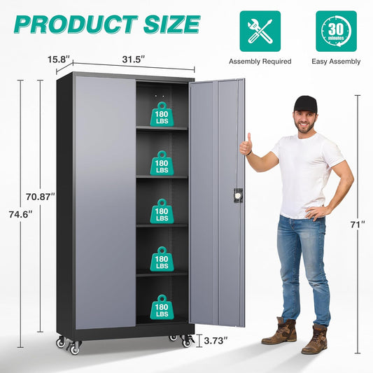 75" Tall Metal Storage Cabinet with Wheels,Rolling Garage Storage Cabinet with Lock,Gray Metal Cabinets with Wheels and Shelves,Tall Tool Cabinets on Wheel for Garage,Home,Office,Shop