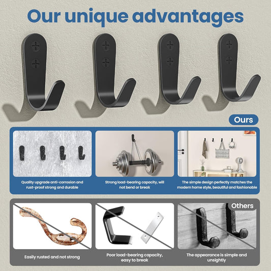 10Pcs Wall Hooks for Bathroom, Kitchen, Closet, and Garage - Black Metal Hooks for Hanging Coats, Towels, Hats, Keys, Bags, and Coffee Cups - Holds Up to 40 lbs