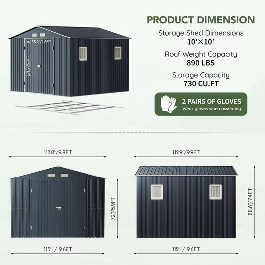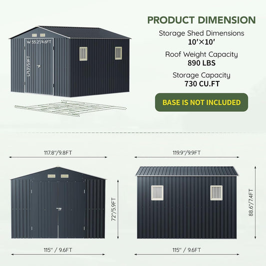 10x10 FT Metal Shed Large Waterproof Outdoor Tools Storage with Clear Roof Windows Air Vent Door for Outside Garden Patio Lawn Backyard to Store Bikes,Lawnmower,Garage,Dark Grey
