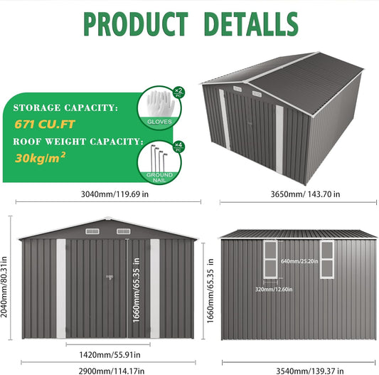 10x12 FT Outdoor Storage Shed Heavy-Duty Galvanized Steel Metal Garden Shed with Lockable Double Doors for Bike, Tool, Generator Storage in Backyard, Patio (10’x12’)