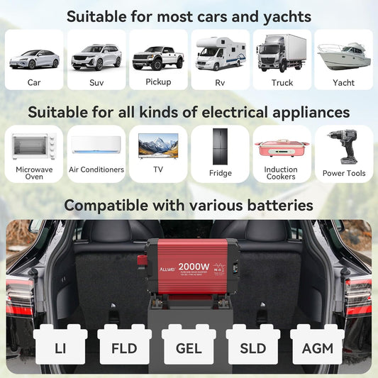 ALLWEI 2000W Pure Sine Wave Inverter 12V DC to 110V AC Converter, Surge 4000W, 2 AC Sockets, LCD Display, Power Inverters for Vehicles, RV, Truck, Home, Solar & Off-Grid Inverter, Remote Controller