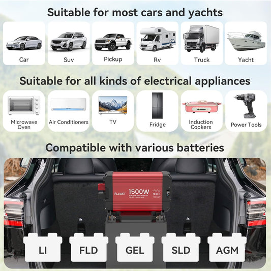 ALLWEI 1500W Pure Sine Wave Inverter 12V DC to 110V AC Converter, Surge 3000W | Power Inverters for Vehicles with 2 AC Outlets, RV Truck Boat Home Outdoor & Off-Grid Solar Inverter, Smart LCD Display