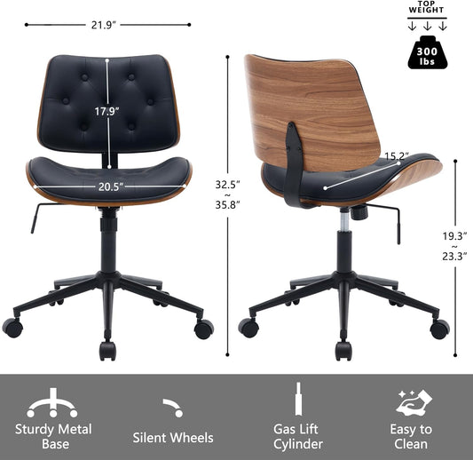 Armless Home Office Chair with Wheels, PU Leather Adjustable Height Computer Desk Chair, 360 Swivel Small No Arms Chair, Modern Button Walnut Style for Office, Reading Meeting Room(Black)