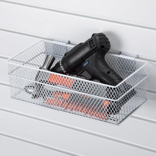 Barydat 4 Pcs Slatwall Basket Set Ventilated Metal Slatwall Basket Hanging Wire Bins Wall Mounted Accessories for Panel Garage Storage Display Organizing(Multi Size,White)