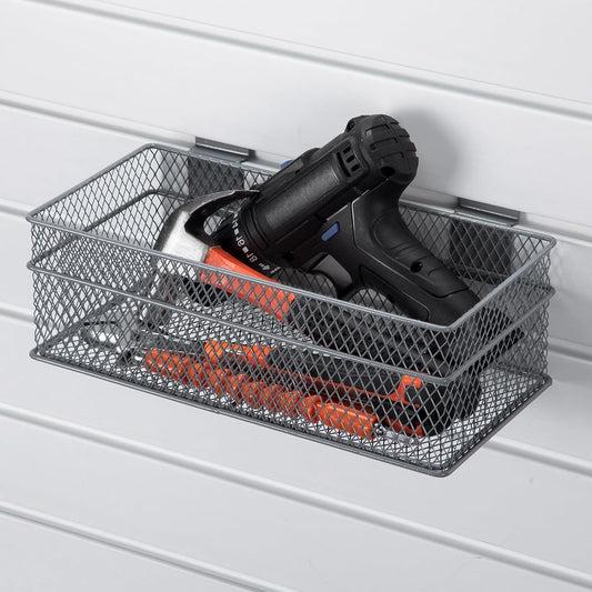 Barydat 4 Pcs Slatwall Basket Set Ventilated Metal Slatwall Basket Hanging Wire Bins Wall Mounted Accessories for Panel Garage Storage Display Organizing(Multi Size,Gray)
