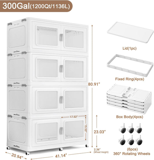 1200 Qt Stackable Storage Bin with Lid, 300Gal Extra Large Collapsible Storage Boxes, Folding Plastic Drawer, Heavy-Duty Store Cabinet, Closet Organizer for Home Kitchen, 4 Pack White