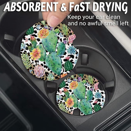Car Coasters for Cup Holders,2.75" Anti Slip Rubber Mat with A Finger Notch, 2 Pack Car Cup Holder Coasters for Car Interior Accessories for Women Men Cactus
