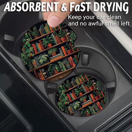 Car Coasters for Cup Holders,2.75" Universal Size Anti Slip Rubber Mat with A Finger Notch, 2 Pack Cup Holder Coasters for Car Interior Accessories for Women Men Vintage Bookshelf