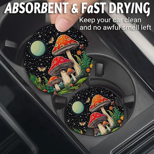 Car Coasters for Cup Holders,2.75" Anti Slip Rubber Mat with A Finger Notch, 2 Pack Car Cup Holder Coasters for Car Interior Accessories for Women Men Mushroom