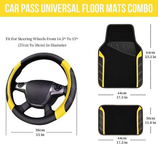 CAR PASS Leather Steering Wheel Cover and Waterproof Car Floor Mats,Microfiber Universal Car Combo Fit for 95% Sedan SUV Van Truck,14.5-15 inch Sporty Anti-Slip Safety Comfortable Design, Black&Yellow