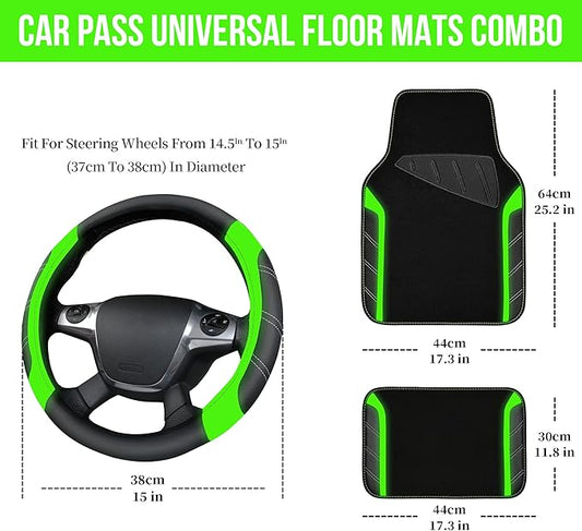 CAR PASS Leather Steering Wheel Cover and Waterproof Car Floor Mats,Microfiber Universal Car Combo Fit for 95% Sedan,SUV,Cars,14.5-15inch Sporty Anti-Slip Comfortable Design(Black&Fluorescence Green)