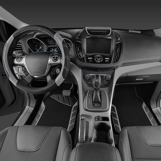 CAR PASS Leather Steering Wheel Cover and Waterproof Car Floor Mats,Microfiber Universal Car Combo Fit for 95% Sedan,SUV,Cars,14.5-15inch Sporty Anti-Slip Safety Comfortable Design(Black&Gray)