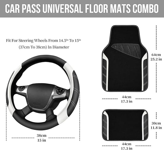 CAR PASS Leather Steering Wheel Cover and Waterproof Car Floor Mats, Microfiber Universal Car Combo Fit for 95% Sedan SUV Van,14.5-15 inch Sporty Anti-Slip Safety Comfortable Design, Black&White