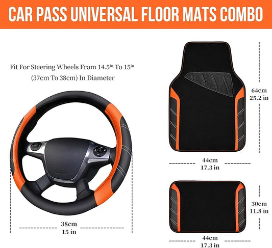 CAR PASS Leather Steering Wheel Cover and Waterproof Car Floor Mats,Microfiber Universal Car Combo Fit for 95% Sedan SUV Van Truck,14.5-15inch Sporty Anti-Slip Safety Comfortable Design, Black&Orange