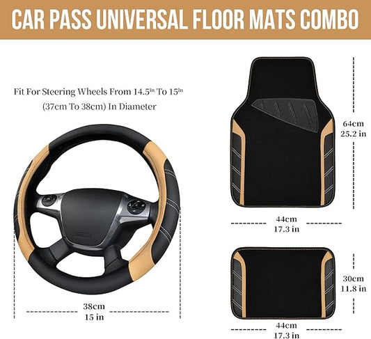 CAR PASS Microfiber Steering Wheel Cover and Waterproof Car Floor Mats,Leather Universal Car Combo Fit for 95% Truck,SUV,Cars,14.5-15inch Sporty Anti-Slip Safety Comfortable Design(Black and Beige)