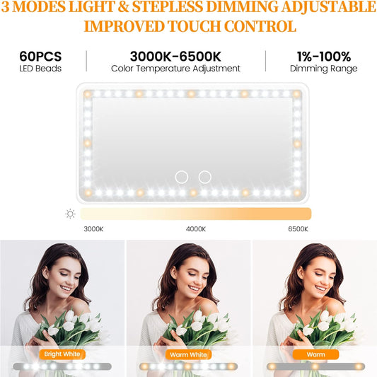 Car Sun Visor Vanity Mirror, with 3 Light Modes & 60 LEDs - Rechargeable Dimmable Clip-on Rear View Sun-Shading Cosmetic Makeup Mirror, Universal for Car SUV(Pure White)
