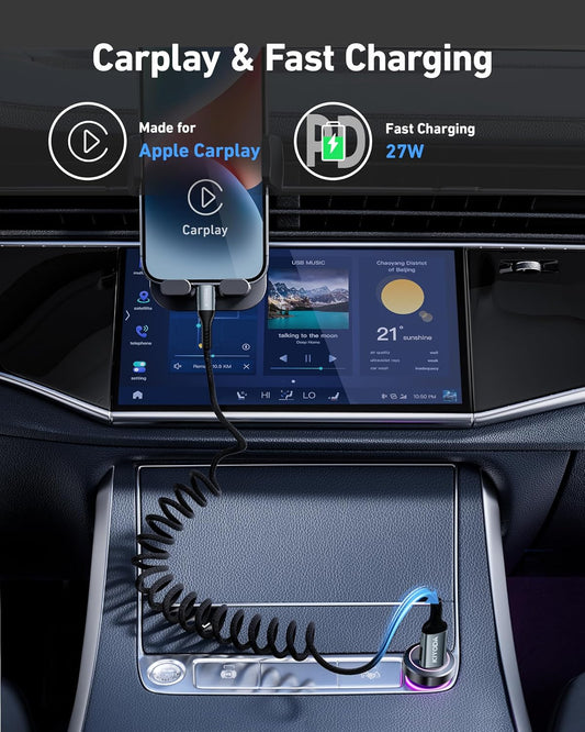 Coiled Lightning Cable for Car, 2Pack Retractable iPhone Charger Cable Fast Charging, [MFi Certified] Short Apple CarPlay USB to Lightning Cord for iPhone 14 13 12 11 Pro Max Mini XR XS 8 SE iPad