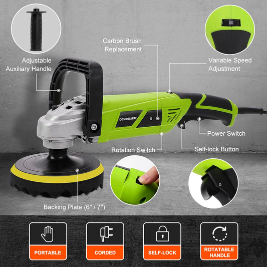 COMOWARE 1300W Professional Car Buffer Polisher - 6-Speed Adj. (600-4000 RPM) with 7"/6" Backing Plates, Auto Detailing Tool for Sanding/Waxing/Polishing by Professionals
