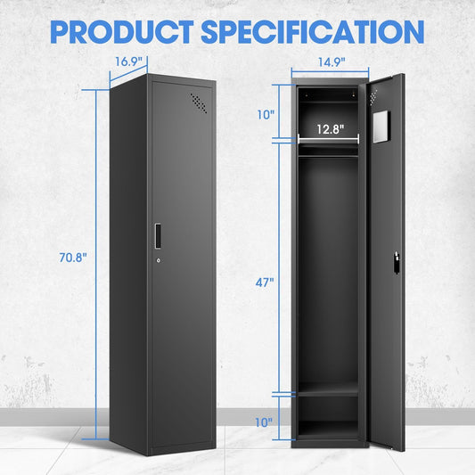DNA MOTORING Metal Storage Cabinet for Employees with Keys, 71" Employees Metal Locker with 1 Doors, Tall Storage Lockers for Garage,Office,Home,Gym, Black, TOOLS-00787-BK-BK