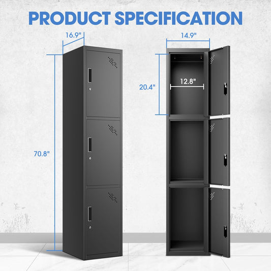 DNA MOTORING Metal Storage Cabinet for Employees with Keys, 71" Employees Metal Locker with 3 Doors, Tall Storage Lockers for Garage,Office,Home,Gym, Black, TOOLS-00789-BK-BK