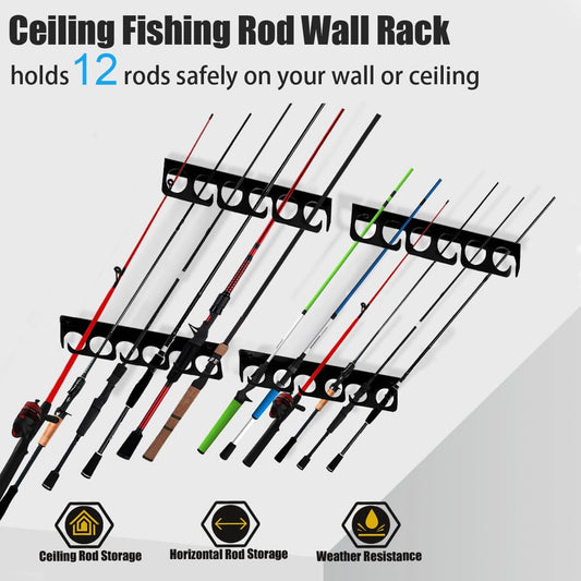 Fishing Rod Rack Pole Wall or Ceiling Storage Holder Hook Keeper Display Hanger Organizer Mount for Garage, Cabin Storeroom Porch and Basement Poles Holds 12 Rods Heavy Duty Metal safe