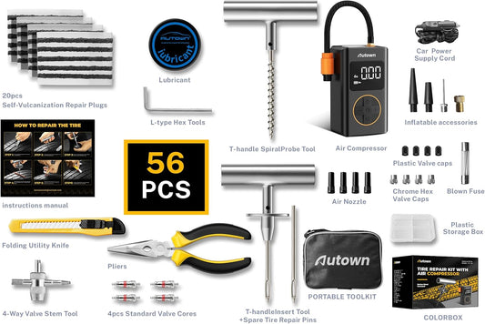 Flat Tire Repair Kit with Air Compressor 54 Pieces for Car, Motorcycle, ATV, Jeep, Truck, Tractor Flat Tire Repair (54PCS)