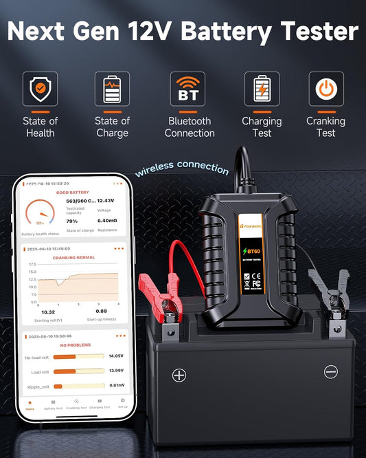 FOXWELL BT60 Car Battery Tester, 12V Bluetooth Battery Load Analyzer via App, 100-2000CCA Automotive Alternator Tester, Cranking Charging System Checker for Car Marine RV Motorcycle Truck ATV