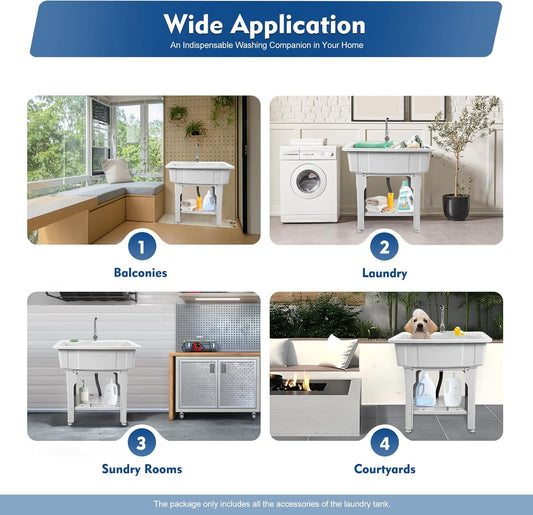 Freestanding Utility Sink Plastic Laundry Tub Spacious Sink with Storage Shelf Indoor Outdoor Wash Station for Bathroom Washing Room (Gray, 31.5*22.05*31.5in)