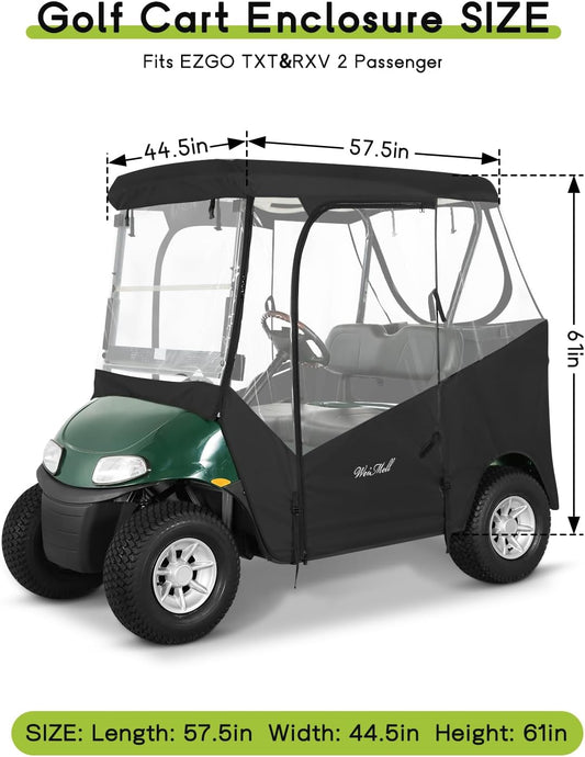 Golf Cart Enclosure 2 Passenger for EZGO TXT & RXV 2-Person Seaters Waterproof Transparent Driving Rain Enclosure Cover with 4-Sided Clear Windows Mirror Zipper Roll-Up Door Black