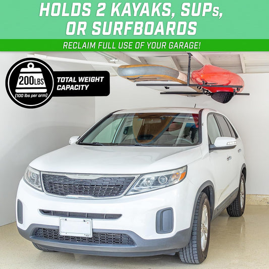 GoSports Kayak Rack for Garage Ceiling Mount - Adjustable Storage Hangers for 2 Kayaks, SUPs, or Surfboards