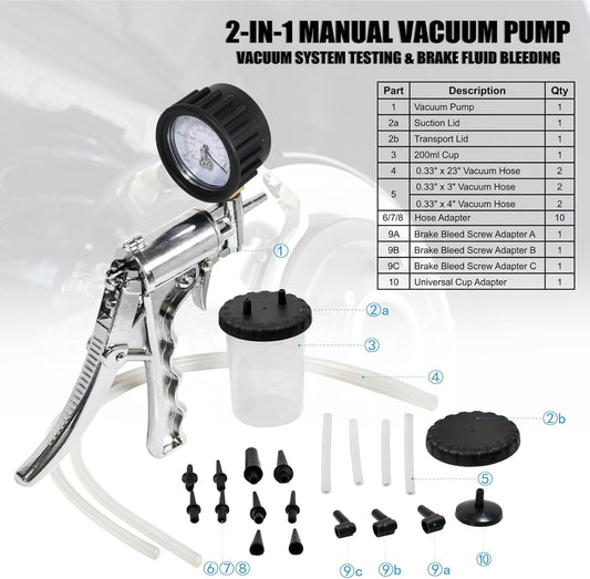 Hand Vacuum Pump Brake Bleeder Kit - Zinc-diecast Metal, Single Person Design for Brake & Clutch Bleeding, Automotive Tuning & Testing