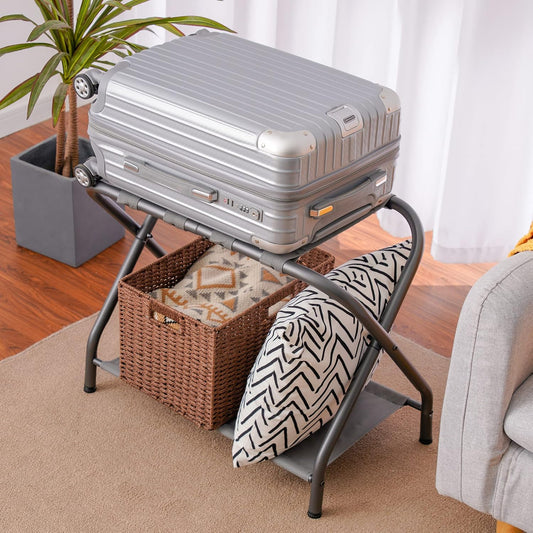 Heybly Luggage Rack, Steel Folding Suitcase Stand with Storage Shelf for Bedroom, Hotel, Foldable Steel Frame, Guest Room Bedroom Hotel, 22.8" L x 11.8" W x 20.9" H, Gray HLR004G1