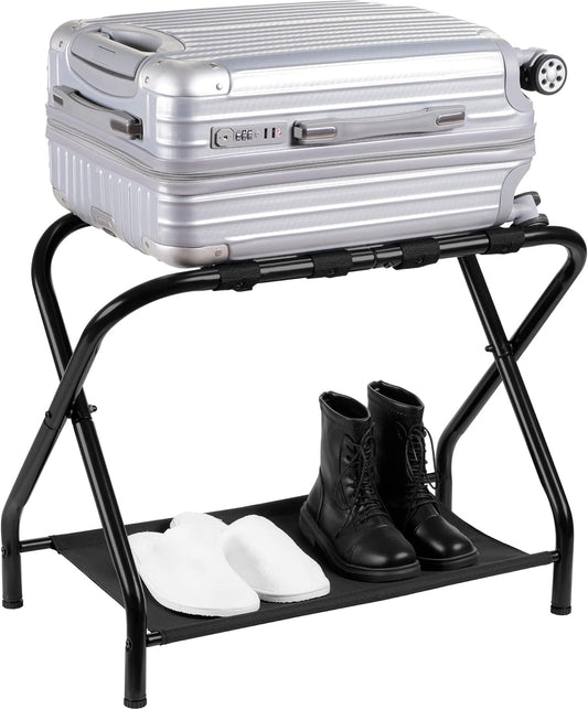 Heybly Luggage Rack, Steel Folding Suitcase Stand with Storage Shelf for Bedroom, Hotel, Foldable Steel Frame, Guest Room Bedroom Hotel, 22.8" L x 11.8" W x 20.9" H, Black HLR004B1